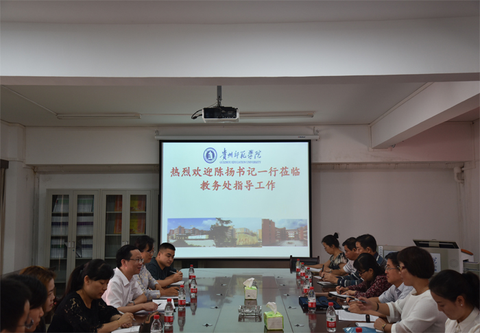 2016年8月29日上午,陈扬书记一行到教务处指导工作,在文韬苑教务处会议室召开调研会,出席会议的校领导有校党委书记陈扬、校党委副书记令狐彩桃、副校长郭文,党政办、组织部、宣传部、人事处、计财处、后勤处、教学质量监测与评估办公室主要负责人以及教务处处、科级干部参加调研会,会议由校党委副书记令狐彩桃组织。